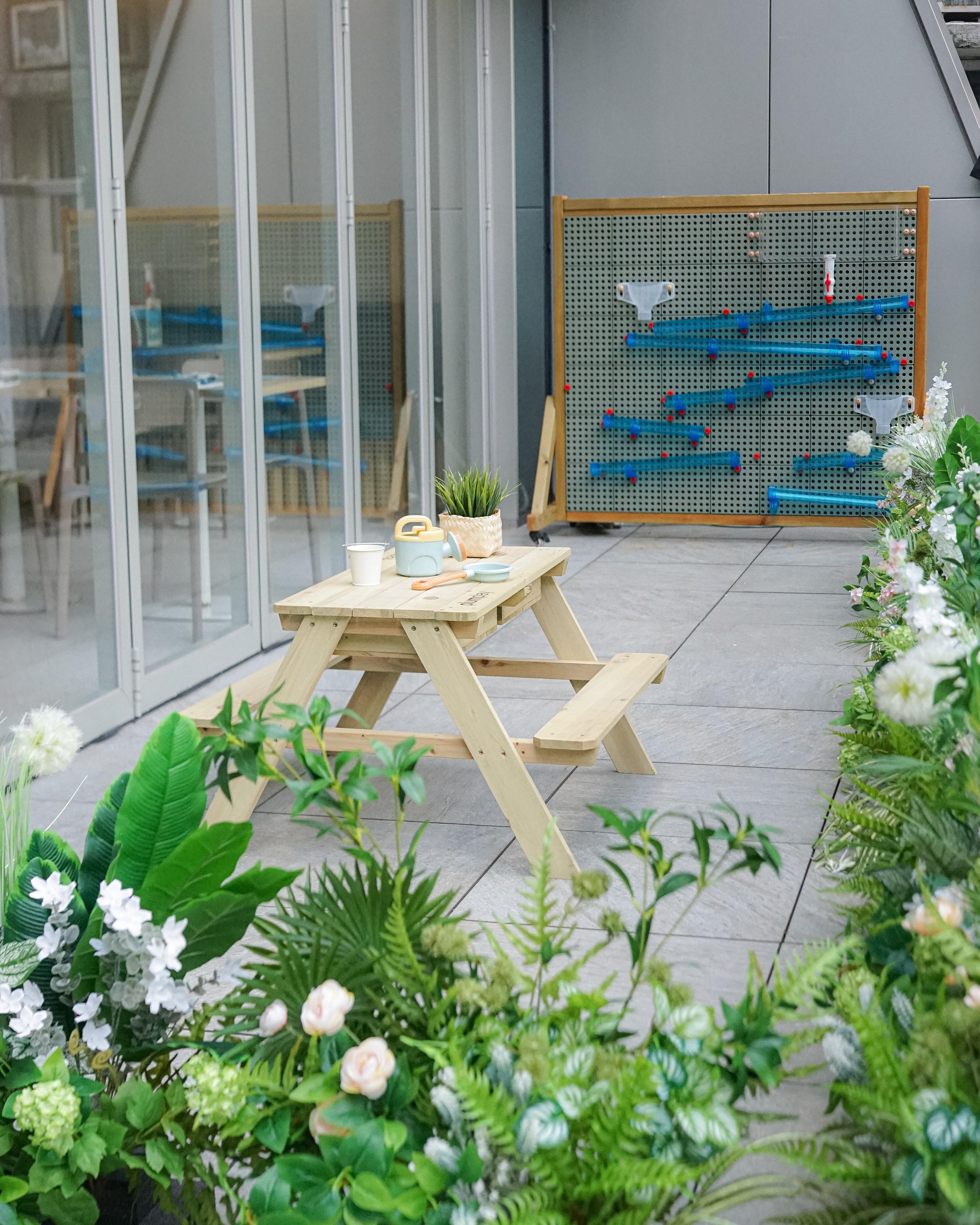 Beautiful outdoor balcony where interactive workshops are held. Stem wall for kiddos to have some water fun play.